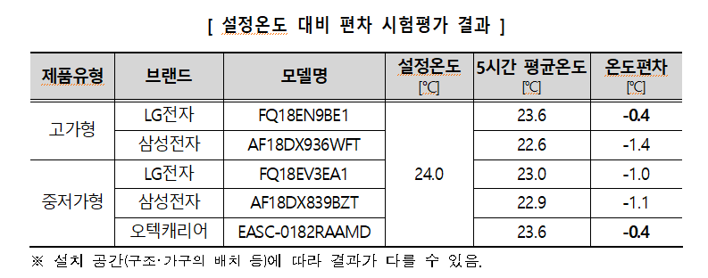 소비자원이 확인한 성능은 냉방속도, 설정온도 대비 편차, 소음 등 이었고, 대상 제품은 올해 출시한 300만 원대의 고가형 LG전자 휘센 모델, 삼성전자 비스포크 모델, 200만 원대의 중저가형 LG전자 오브제컬렉션 모델, 삼성전자 비스포크 모델, 오텍캐리어 오퍼스탠드 모델다.