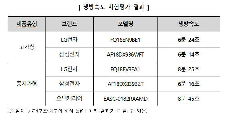 35℃로 유지된 설치 공간에서 에어컨을 24℃⋅강풍으로 설정하여 작동시킨 후 실온이 24℃로 낮아지는 데 소요되는 시간을 측정한 결과, AF18 DX936 WFT⋅⋅ AF18DX839BZT(삼성전자)AF18 DX839 BZT(삼성전자), FQ18 EN9 BE1(LG전자)(LG전자) 등 3개 제품이 각각 6분 14초, 6분 16초, 6분 24초로 냉방속도가 우수하였음.