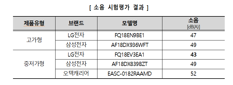 에어컨을 24℃⋅강풍으로 설정하여 에어컨(실내기)에서 발생하는 최대 소음을 측정한 결과, LG 전자의 중저가형 오브제컬렉션 소음이 43dB로 가장 조용했다. 그 외의 다른 제품들도 47~52dB 수준으로 관련 기준*에는 적합한 수준이었다.