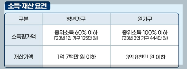 - 청년 가구 : 기준 중위소득 60% 이하 (1인 가구 기준 116만 원/월)